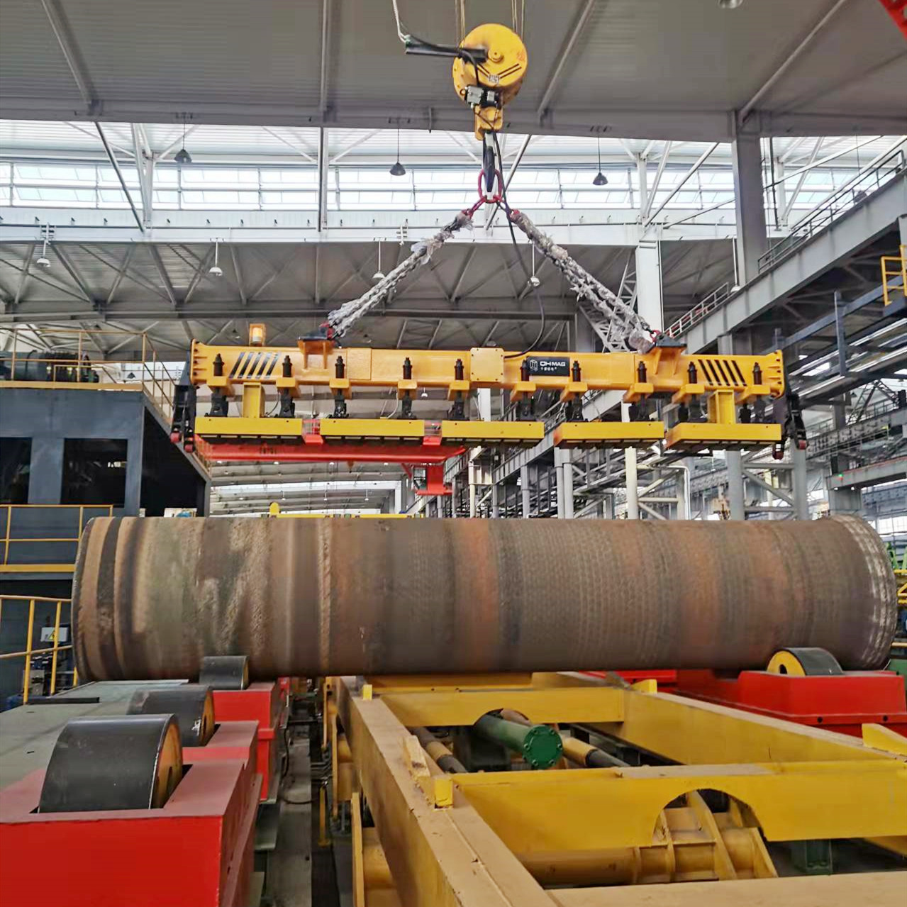 千豪電永磁吊具在吊鋼板,鋼管,鑄管等導磁工件上取得廣大顧客的認可與返購。使用電永磁吊具吊裝鋼管及鑄管圓形導磁工件,只需要吸附一部分接觸面即可吸吊起8噸、10噸、16噸,32噸.