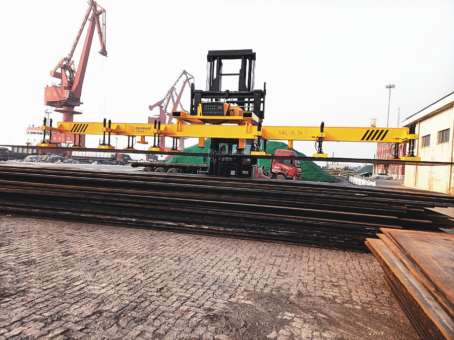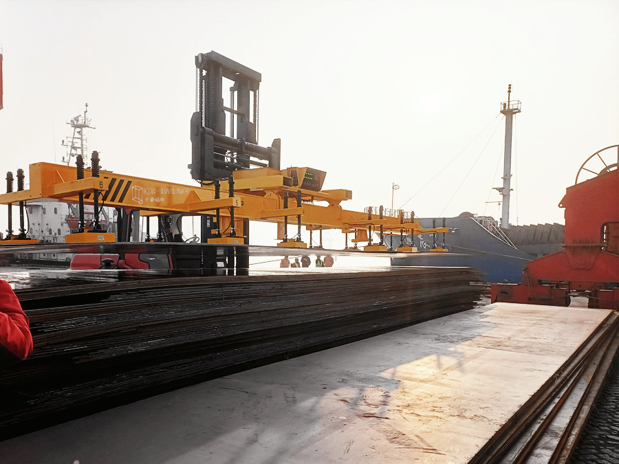 此款磁力吊具用在港口配合叉車使用吊運(yùn)長(zhǎng)鋼板。本套充電式鋼板起重吊具采用12組電永磁起重器聯(lián)吊。可實(shí)現(xiàn)單張鋼板max重量為4噸、厚度8mm、10mm、12mm鋼板一次搬運(yùn)二張平穩(wěn)運(yùn)行。厚度14mm、16mm鋼板一次搬運(yùn)一張平穩(wěn)運(yùn)行。